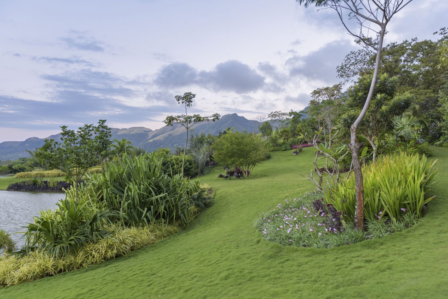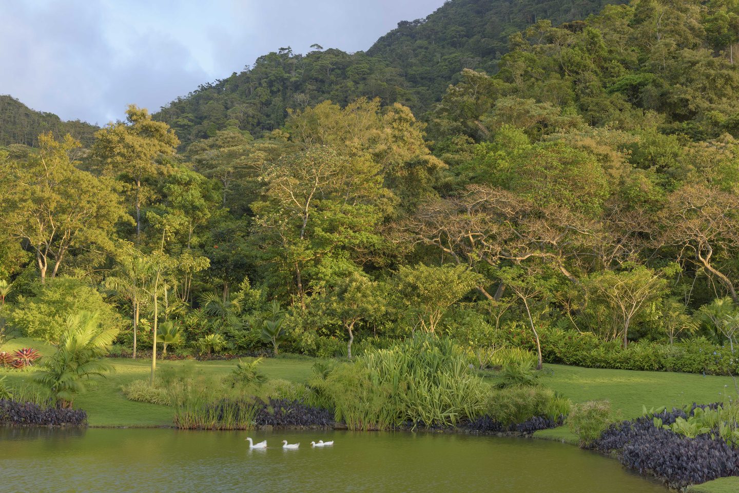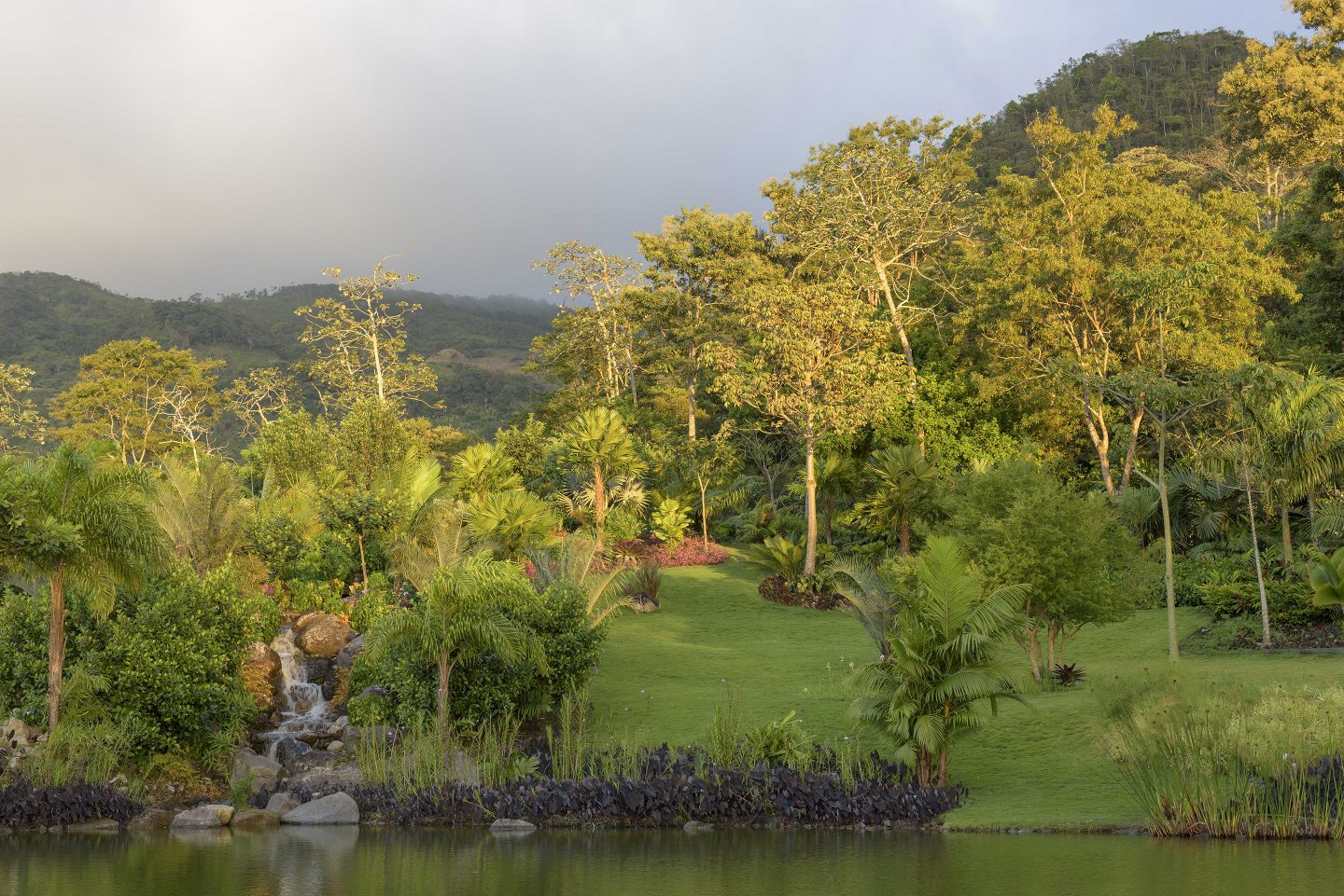 With the Panamanian site’s annual rainfall totaling more than 70 inches per year, the lake we created not only solved the need for fill but also acted as a point to harvest on-site and off-site rainwater. The uphill slope was used to aerate the site water through a series of pools, and boulder-filled cascades. The boulders were a by-product of the excavation and grading process. The catchment of on-site drainage and areas of varying elevations and exposures to sunlight created a variety of micro-climates. The lake immensely enriches the habitat and biodiversity of the area and magnifies the beauty of its context through its reflective nature. A small dock acts as a special destination for the grandchildren to feed the waterfowl and fish.