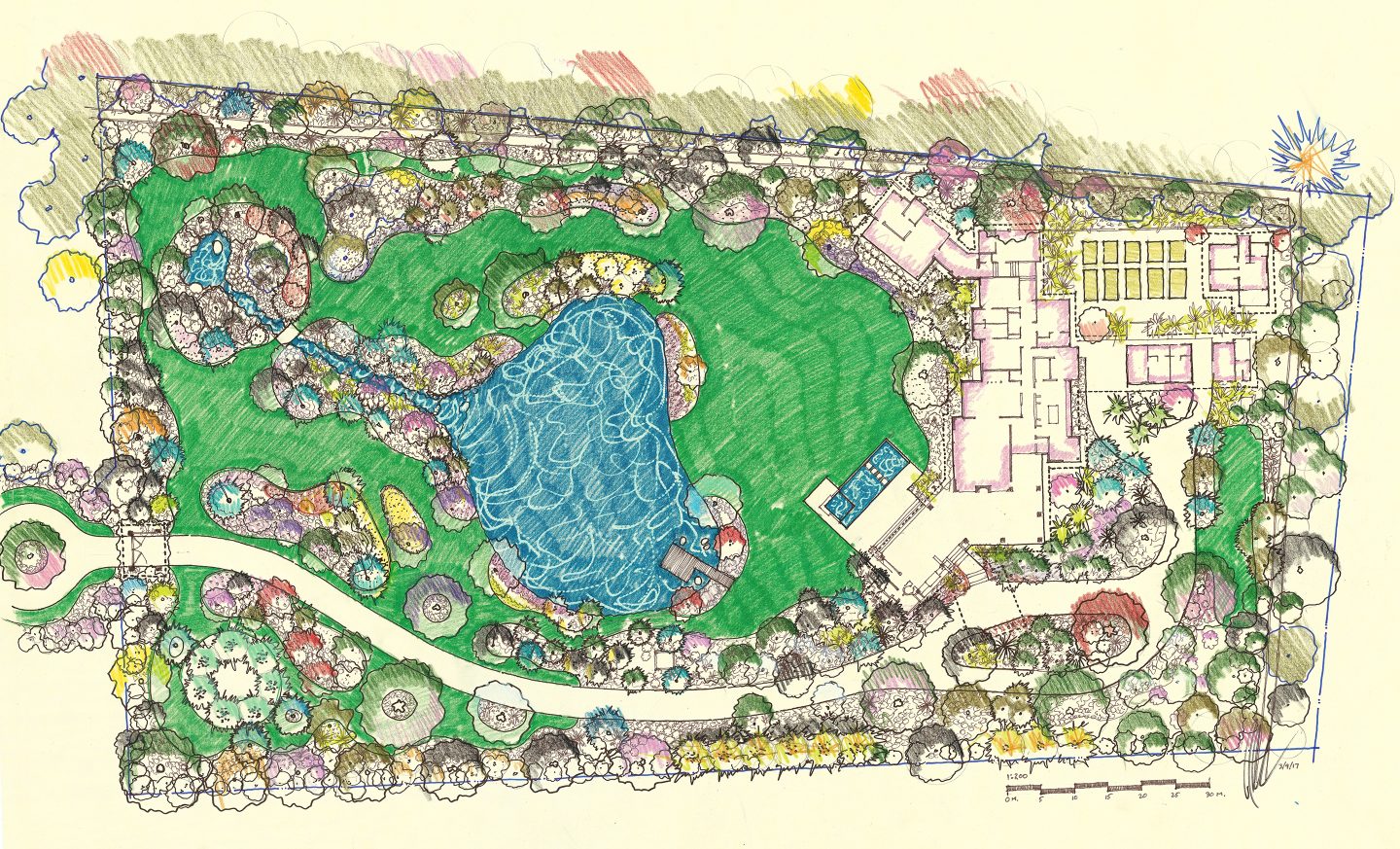 The client’s architect, upon his initial site visit, was not enthralled with the land, as it was devoid of trees, flattened and terraced in an unsightly manner, and lacked interesting landforms. Upon the initial site visit, Jungles was inspired by the distant views of the unspoiled verdant landscape and the geologic character of the ancient volcano rim. The siting of the buildings of the architect’s program was guided by critical viewsheds highlighted by Jungles and concurrently developing grading plans.