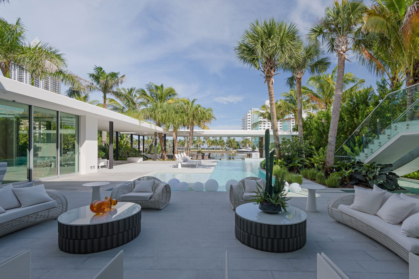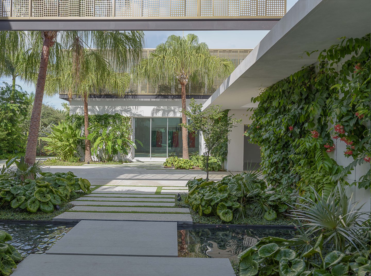 RJI, in collaboration with SAOTA Architects, created a naturalistic habitat that blurs interior and exterior spaces forming interactive gardens throughout the residence. The design of the residence incorporates a dramatic introverted atrium allowing lush greenery to invade the home. Vines of deep green climb the crisp white architecture to further tie the home to its tropical surroundings.