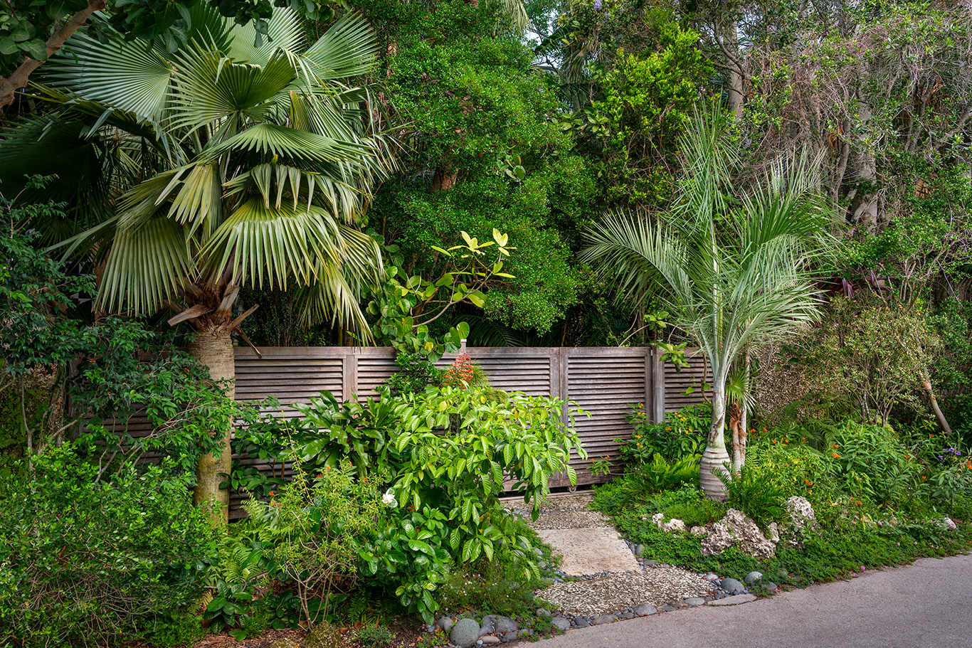The approach to the house was missing a key element, a pronounced entryway. Raymond created a boardwalk that leads from the parking area to the front door. Here, the garden foundation is predominantly native yet delicately embellished with specimen cycads Raymond had lovingly nurtured for twenty years.