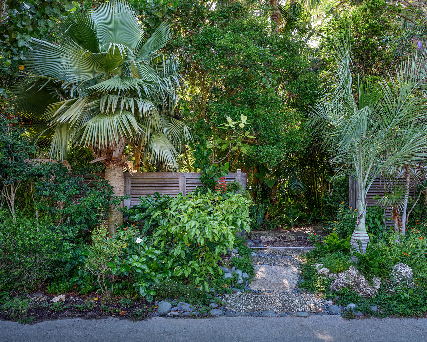 Much like RJI’s studio garden, he and Gina decided to heavily landscape the public realm and streetscape portions of the property. A specimen Baobab tree gracefully arches over the Commodore Trail and an oolite veneered wall turns green to match that of the many native shrubs that provide habitat for the local fauna. This gesture has greatly enhanced the neighborhood for the public to enjoy.