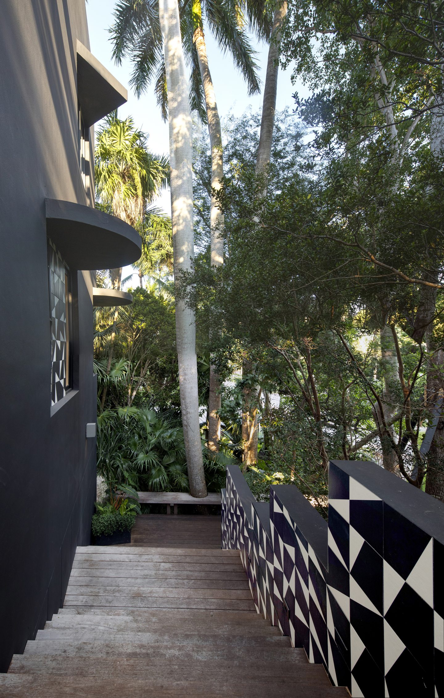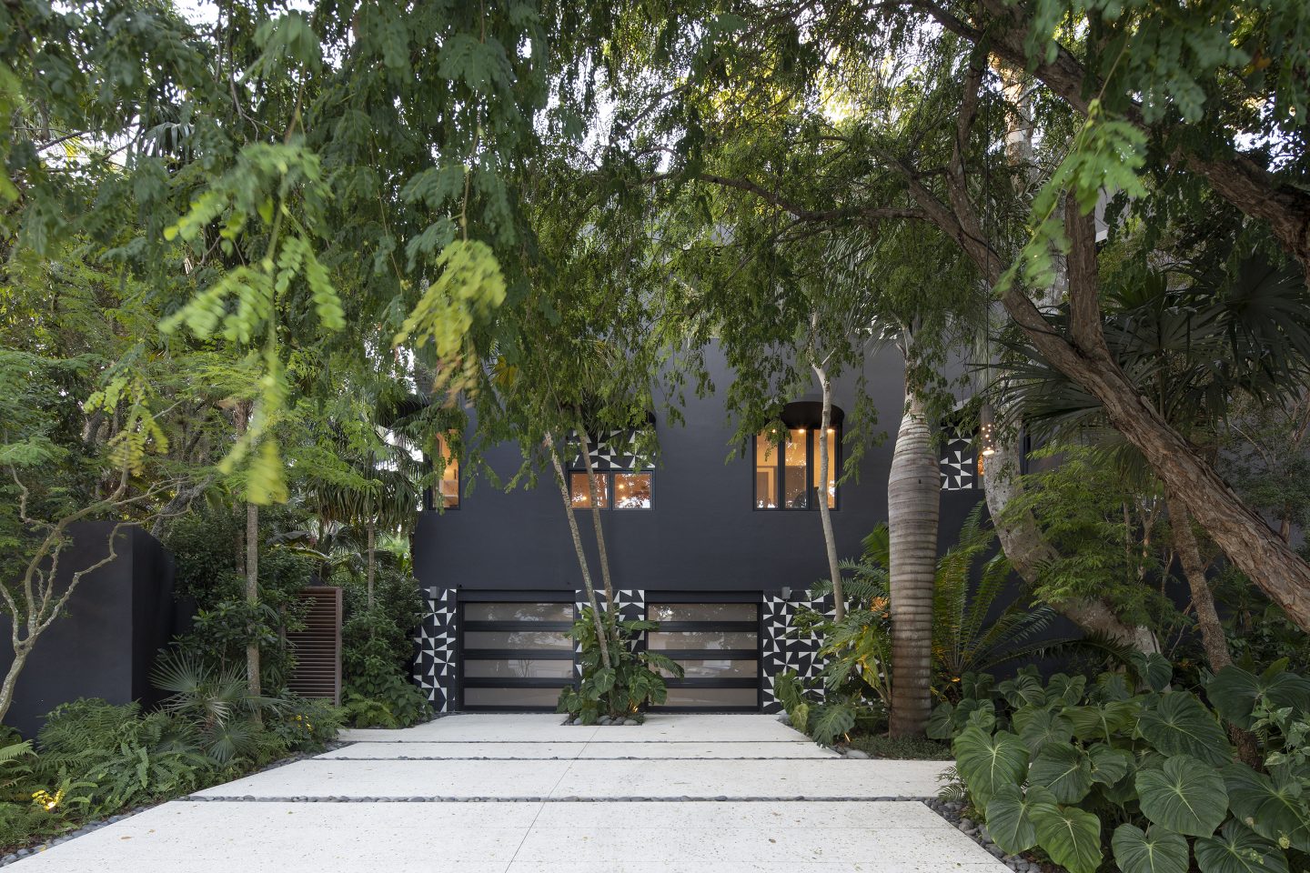 The house was painted charcoal to allow the plants to be the focus. The front façade’s dated tile elements were playfully redesigned by Gina Jungles in a black and white ceramic tile composition. At night, the structure recedes and glows like a lantern, further illuminating the textures of the three-story forest’s fronds and branches.